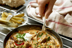 Servera med ris, potatis eller ett gott surdegsbröd och en grön sallad.